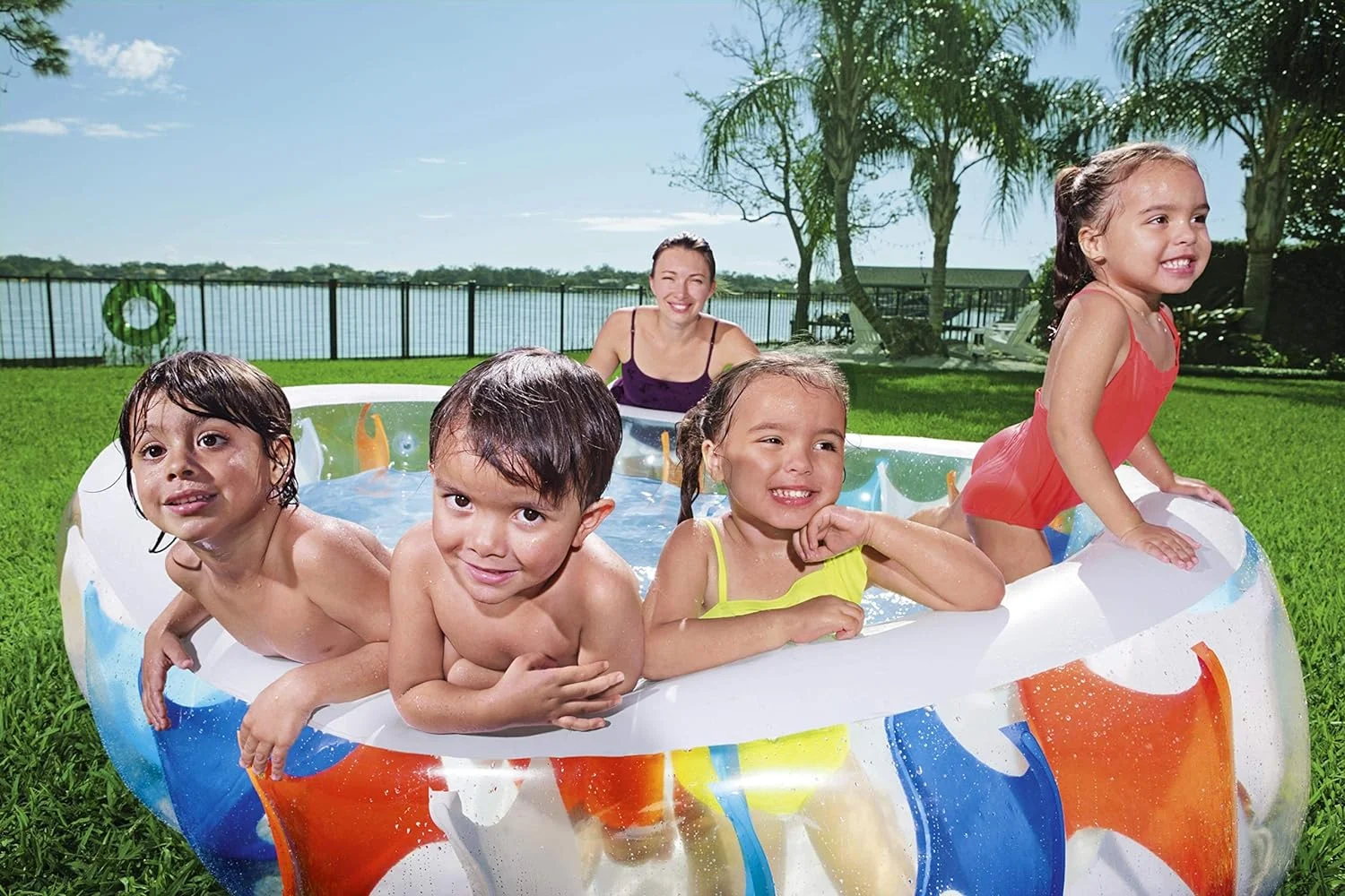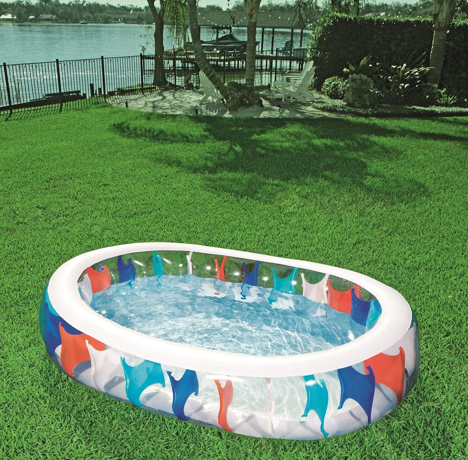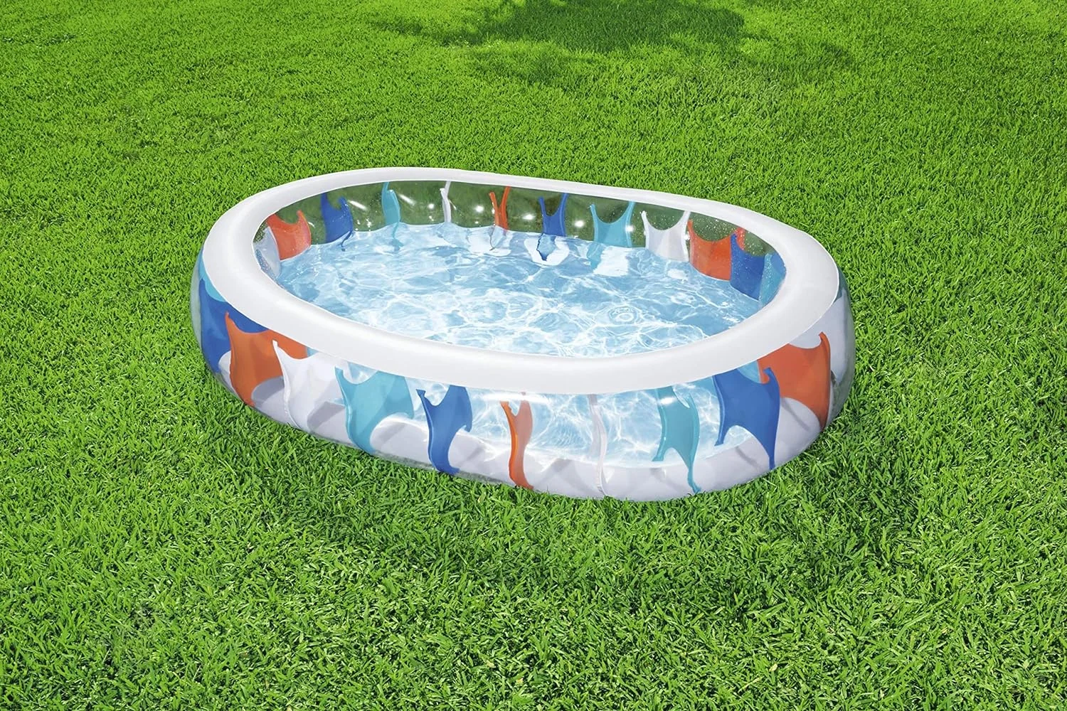 بُسين بيضاوي من Bestway بألوان مبهجة وسعة كبيرة، مناسب لكل البطابيط اللي عايزين يرشّوا ويضحكوا براحتهم!