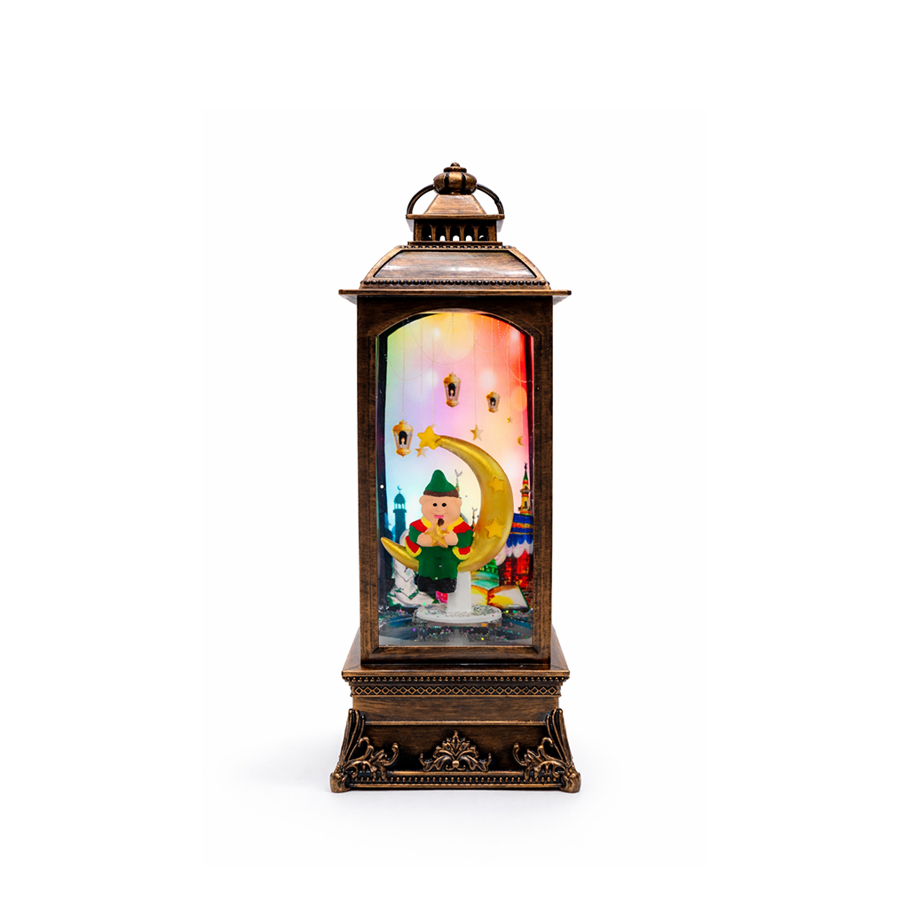 جوه الفانوس شخصيات فنانيس في مشهد رمضاني جميل، ومع الحركة الفانوس بيعمل حركة حلوة وينزل تلج وجليتر حوالين الشخصيات، منظر يفرّح أي طفل ويخلّي رمضان ليه طعم مختلف ❄️